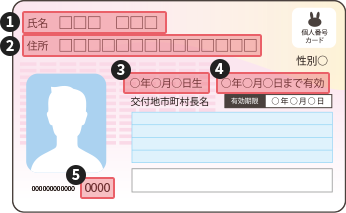 - マイナンバーカードに記載の❸生年月日、❹有効期限(年のみ)、❺セキュリティコードが必要。