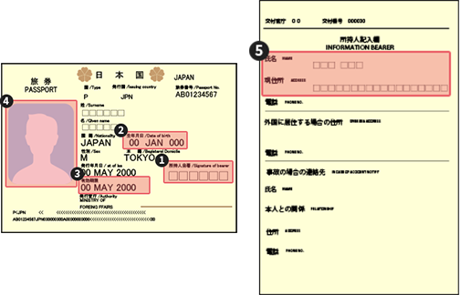 - 申込時に入力した❶氏名・❷生年月日・❸有効期限・❹本人写真・❺所持人記入欄の氏名及び住所と一致していること。