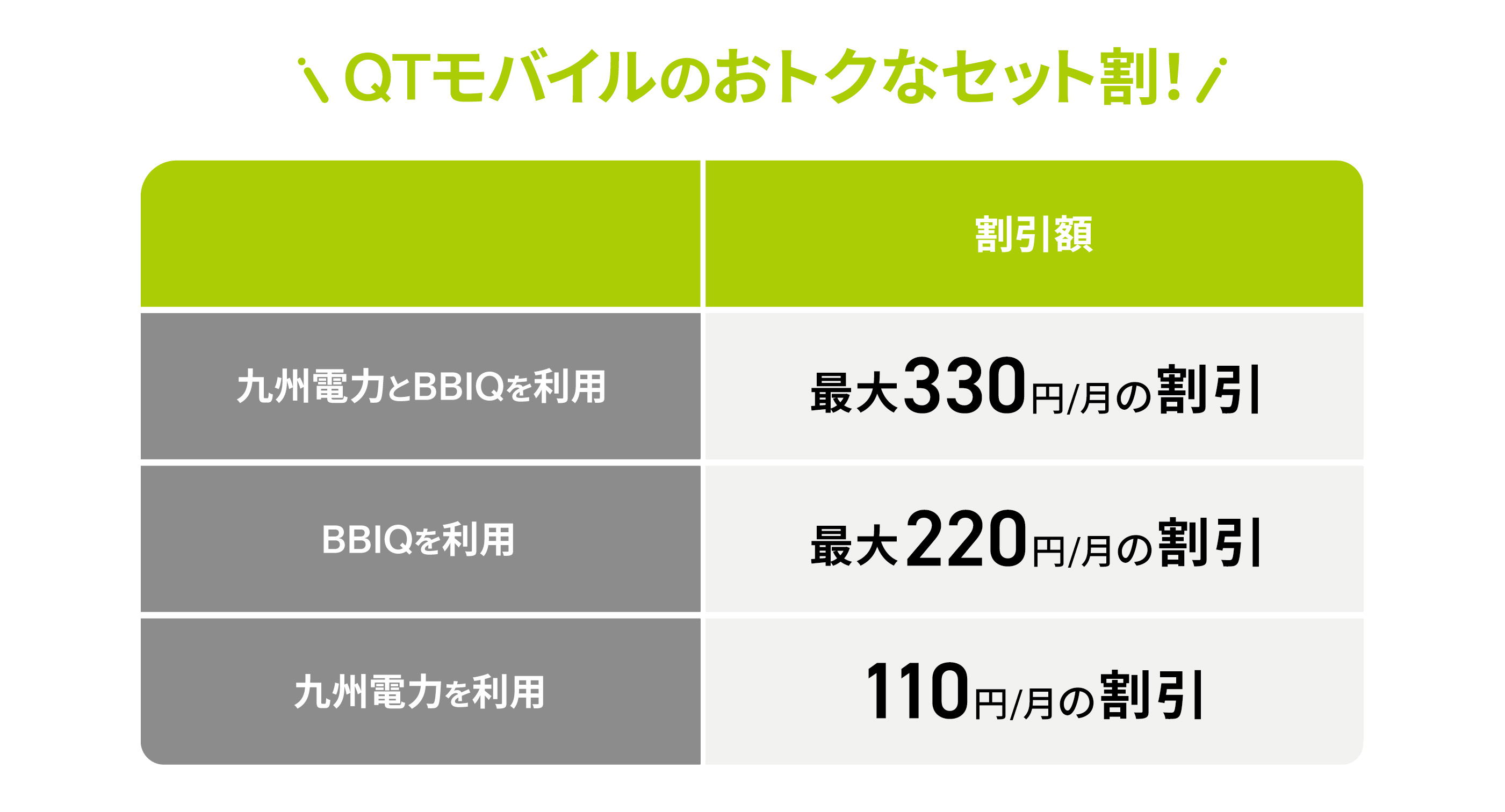 QTモバイルでは九州電力とBBIQとのセット割があり、それぞれの料金プランを同時契約すると、最大330円/月の割引を適用可能です。