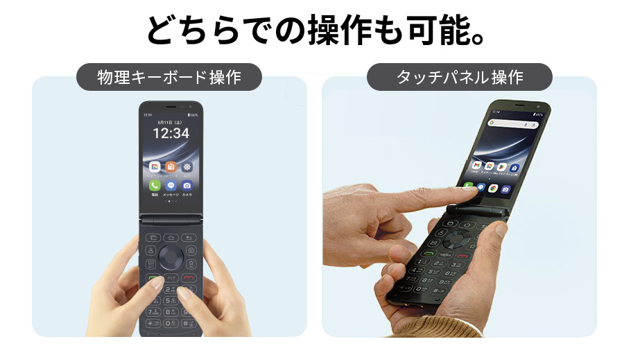 ケータイスタイルの物理キーボードとスマホスタイルのタッチパネル、二つの操作を自由に使い分けることが可能な折りたたみスマーフォンです。