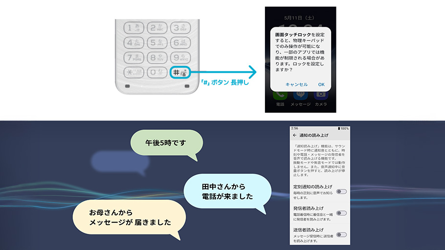 「画面タッチロック機能」を有効にしてガラケーのように使用することができたり、見逃しがちな通知を「音声」でお知らせしてくれる機能※を搭載しています。