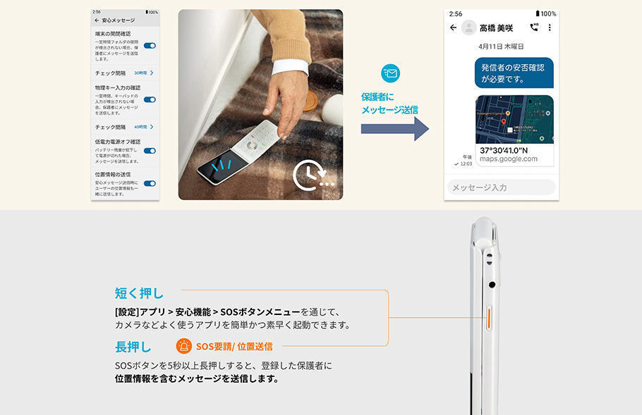 また、サイドに搭載されている「SOSボタン」利用することで、よく使うアプリを起動したり、5秒以上長押しすると登録された保護者に位置情報を含むメッセージを送信することができます。
