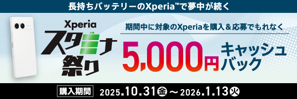 ※3 Xperiaユーザーのバッテリー使用プロファイル標準値から、インターネット閲覧・動画閲覧・ゲーム・その他の機能を1日あたり360分利用(1080分の待機時間)することを想定したテストで、48時間利用してもバッテリーが残ることを意味します。実際のバッテリー残量はお客さまのご使用環境やご利用状況によって異なります。