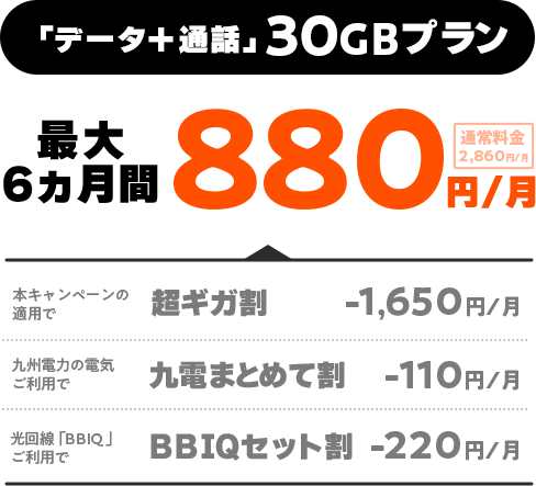 BBIQとQTモバイル「データ+通話」コースをご利用の場合、QTモバイル月額料金を220円/月割引(2GBの場合110円/月割引)いたします。BBIQオフィスタイプ、マンションまるごとBBIQは対象外です。本割引はBBIQとご契約者名義が同一かつログインIDが同一の場合、自動適用となりますが、ご家族名義(同一住所に限ります)の場合はお申込みが必要です。BBIQが利用休止中や移転手続き中の場合、またはご利用料金のお支払いが確認できなかった場合は、割引が停止となります。
