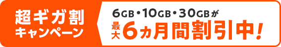 - ・利用開始月を含む最大6ヵ月間の月額基本料金から割引きします(6GB:770円割引き、10GB:880円割引き、30GB:1,650円割引き)。対象プラン(6GB/10GB/30GB)以外にプラン変更された場合、割引は適用されません。